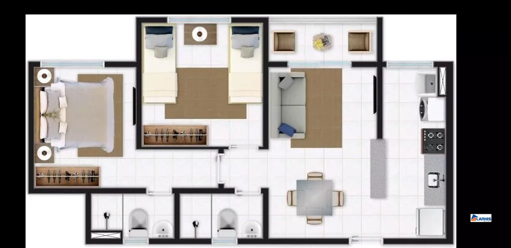 02 quartos / sendo 01 suíte + quarto solteiro