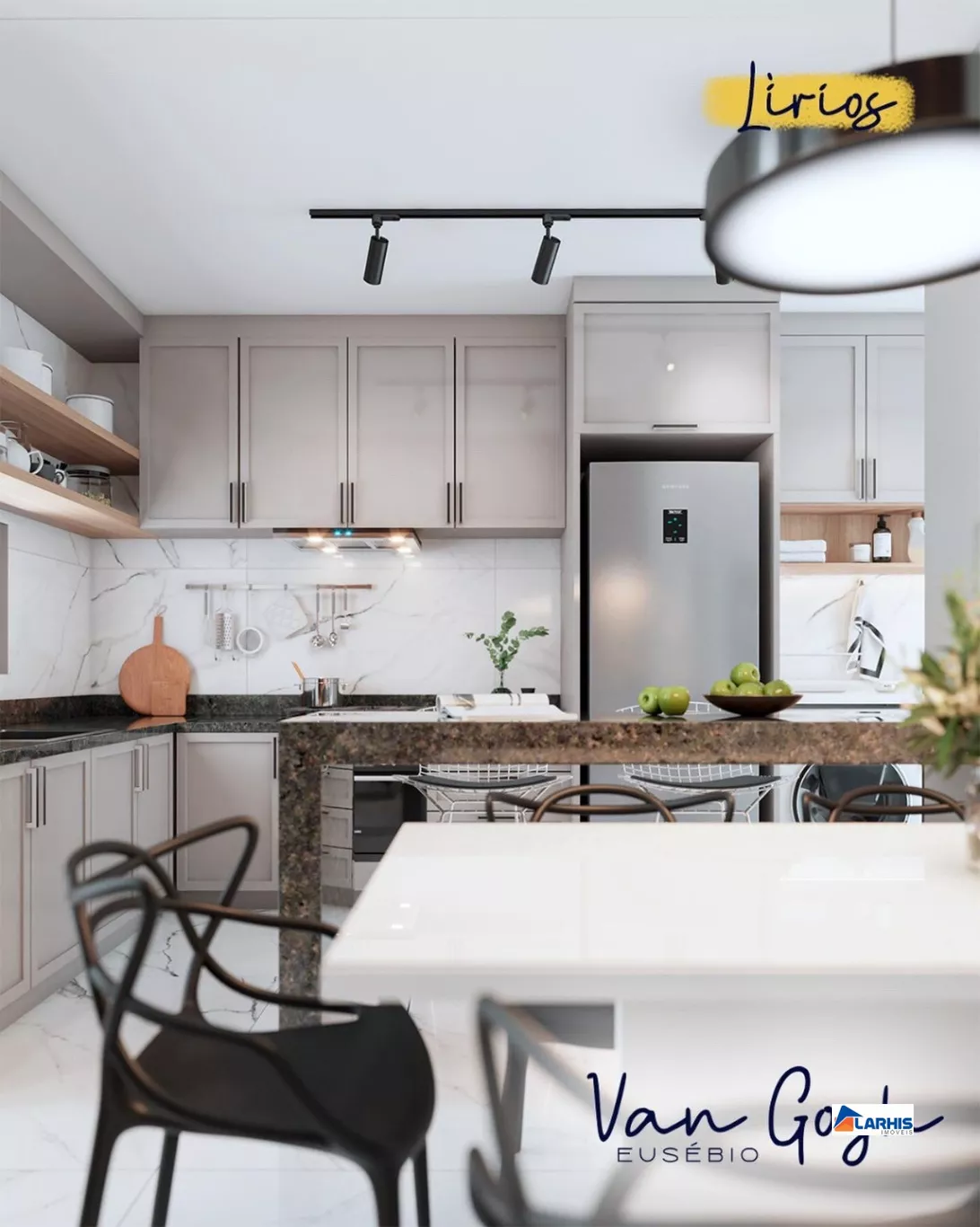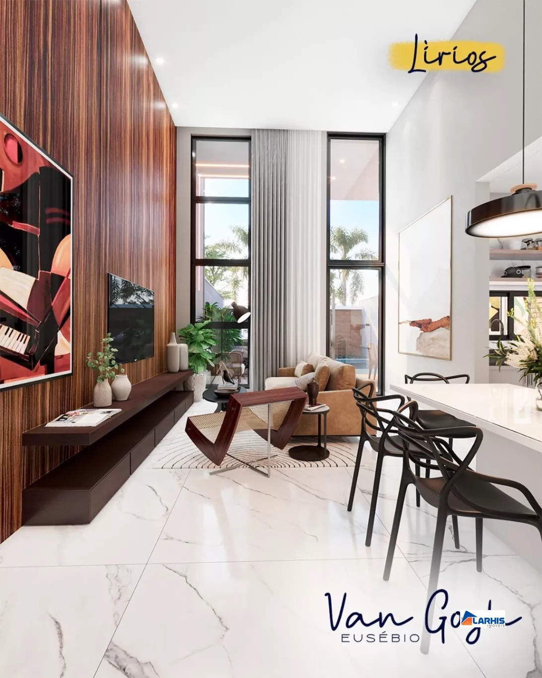 ?Sala 2 ambientes integrada a cozinha, ambos com pé direito elevado.
